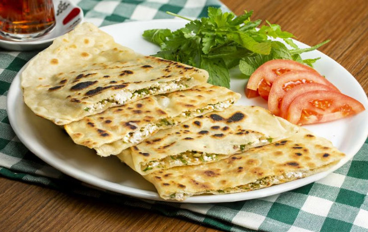Gözleme is a savory Turkish stuffed turnover. The dough is usually unleavened, and made only with flour, salt and water, but gözleme can be made from yeast dough as well. It is similar to bazlama, but is lightly brushed with butter or oil, whereas bazlama is prepared without fat. The dough is rolled thin, then filled with various toppings, sealed, and cooked over a griddle. Gözleme may sometimes be made from prepackaged hand-rolled leaves of yufka dough.
