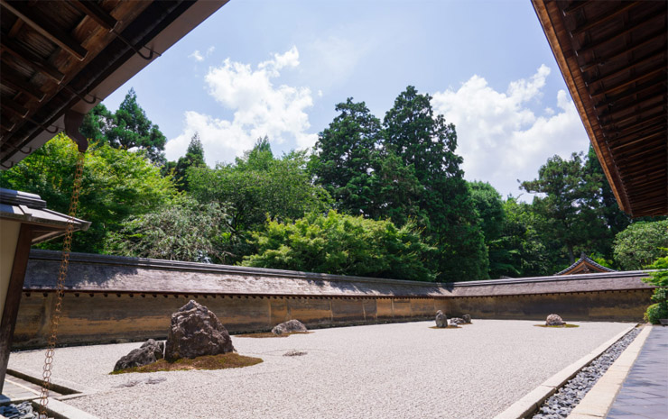1450년 무로마치 시대에 다이묘 호소카와 가쓰모토가 세웠고 이후 전란과 화재를 거치며 재건되었다. 1994년 '고도 교토의 역사유적' 중 하나로 유네스코 세계문화유산에 등록되었다. 료안지 하면 가장 먼저 떠오르는 것은 바로 '가레산스이(枯山水) 양식'의 돌 정원으로 물을 사용하지 않고 흰 모래와 돌만으로 산수(山水)의 풍경을 표현한 일본식 정원이다. 가로 약 25m, 세로 약 10m의 직사각형이며 흰 자갈이 깔린 평면 위에 이끼 낀 돌 15개가 배치되어 있다. 독특하게도 어떤 위치에서 보든 15개의 돌을 한 번에 모두 볼 수 없도록 설계되어 있어 14개만 보이고, 1개는 숨겨진다 한다. 전통적으로 "모든 돌을 보는 것은 깨달음이 있을 때뿐"이라는 이야기도 전해진다. 이 배치는 단순한 미적 구도가 아닌, '불완전함 속의 완전함', '보이지 않음 속의 탐구', '마음의 여백과 사색'이라는 선(禪)의 철학을 상징한다. 돌 정원 외에도, 연못과 산책로가 있는 수경정원, 차실, 오래된 목조건축물 등 료안지 경내는 매우 풍부하고 조화로운 공간이다.
