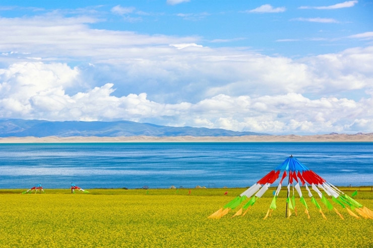칭하이 호수 해발 3,200m 고지에 위치한 중국 최대의 내륙 염호(소금 호수)다. 칭하이성(청해성)의 이름이 바로 이 호수에서 유래했을 만큼 상징적인 곳이며, '고원의 푸른 사파이어'라는 별명을 가지고 있다. 특히 7월 ~ 8월에는 칭하이 호수가 가장 아름다운 시기로 호숫가를 따라 끝없이 펼쳐진 노란 유채꽃과 짙푸른 호수, 그리고 그 뒤로 펼쳐진 만년설산이 어우러져 한 폭의 유채화 같은 풍경을 선사한다.
