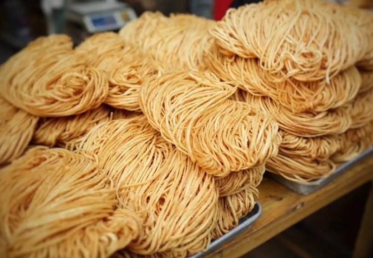 Sangza is a popular snack in Xinjiang consisting of deep-fried noodles in a twisted pyramid shape. The snack is made by pulling wheat flour dough into thin ropes, which are deep-fried. Bunches of the ropes are then shaped into rings, which are stacked into a pyramid. Sangza is also eaten in other areas of China where the Hui minority live.