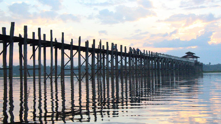 U Bein Bridge is a crossing that spans the Taungthaman Lake near Amarapura in Myanmar. The 1.2 km bridge was built around 1850 and is believed to be the oldest and (once) longest teakwood bridge in the world. Construction began when the capital of Ava Kingdom moved to Amarapura, and the bridge is named after the mayor who had it built. It is used as an important passageway for the local people and has also become a tourist attraction and therefore a significant source of income for souvenir sellers. It is particularly busy during July and August when the lake is at its highest.