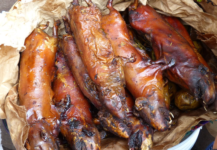 Cuy frito or cuy chactado is one of the oldest traditional Peruvian dishes that has been consumed since Incan times. It is made with guinea pigs, which are obviously not kept as pets in Peru – instead, they are fried to crispy perfection. The fried guinea pigs are said to taste similar to chicken (or as a cross between rabbit a chicken), but with a fattier flavor. The head is also edible, and that's the favorite part for many people. Cuy frito is usually eaten with your hands, and it's recommended to keep some napkins on hand as things can get a bit messy while eating it. This dish is typically served in cuyerías with corn on the cob, rice, potatoes, sweet potatoes, salsas, and salads.