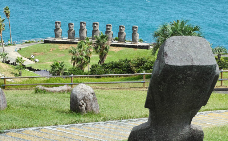 푸르게 펼쳐진 태평양이 내려다보이는 언덕 꼭대기에 자리한 선메세 니치난은 이스터섬의 모아이 조각상을 재현한 복제품으로 유명한 야외 공원입니다. 선메세 니치난의 주요 관광 명소는 모아이 조각상 복제품입니다. 5m 높이를 자랑하는 이 조각상은 바다를 바라보고 있습니다. 전설에 따르면 오른쪽에서 두 번째 조각상을 만지면 재물운, 왼쪽에서 세 번째 조각상을 만지면 연애운이 좋아진다고도 합니다.