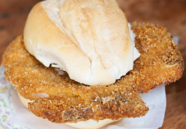 The ingredients of a pork chop bun are only a piece of bone-in pork chop and a lightly toasted and buttered bun.