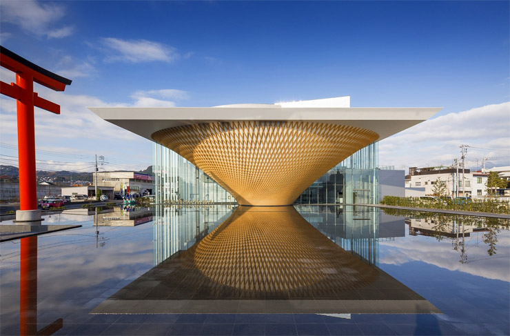 The Mount Fuji World Heritage Center is a museum in Fujinomiya dedicated to Mount Fuji. Opened in 2017 to commemorate the mountain's designation as a UNESCO World Heritage Site four years prior, the center boasts a viewing deck and a variety of exhibitions pertaining to the volcano's seismology, history and cultural significance. The building has an inverted conical form that reflects in the pond outside to reveal the shape of the iconic mountain.